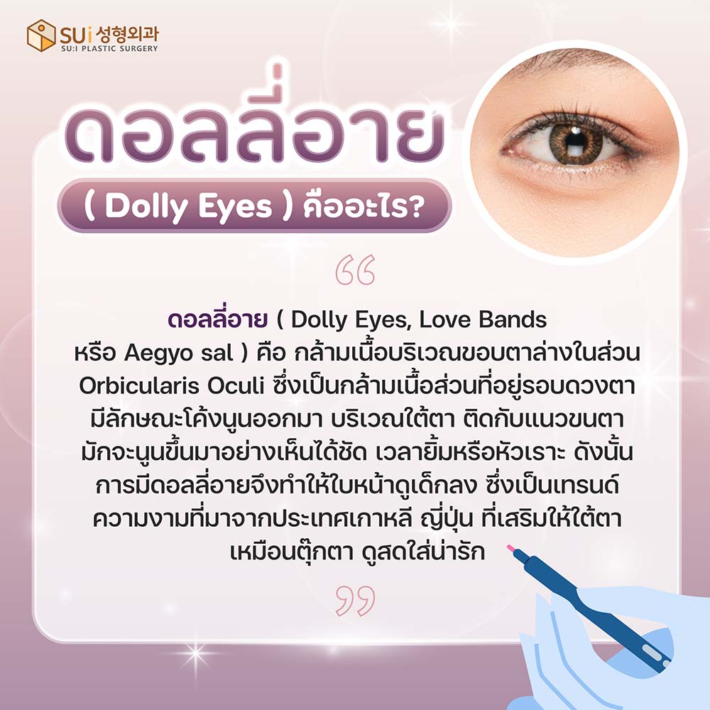 ดอลลี่อาย(dolly eye) เป็นกล้ามเนื้อรองรับขอบตาล่าง (obicularis rolls) มีลักษณะผิวหนังโค้งนูนออกมาบริเวณใต้ตา ดูตึงกระชับและเป็นขอบชัดเจนติดกับแนวขนตาซึ่งเป็นเทรนด์ความงามจากประเทศเกาหลีที่ได้รับความนิยมสูงมากในประเทศไทย เพราะเป็นการเพิ่มเพิ่มเสน่ห์ความสดใสให้กับดวงตาแถมยังช่วยทำให้ใบหน้าดูน่ารัก และดูเด็กลง