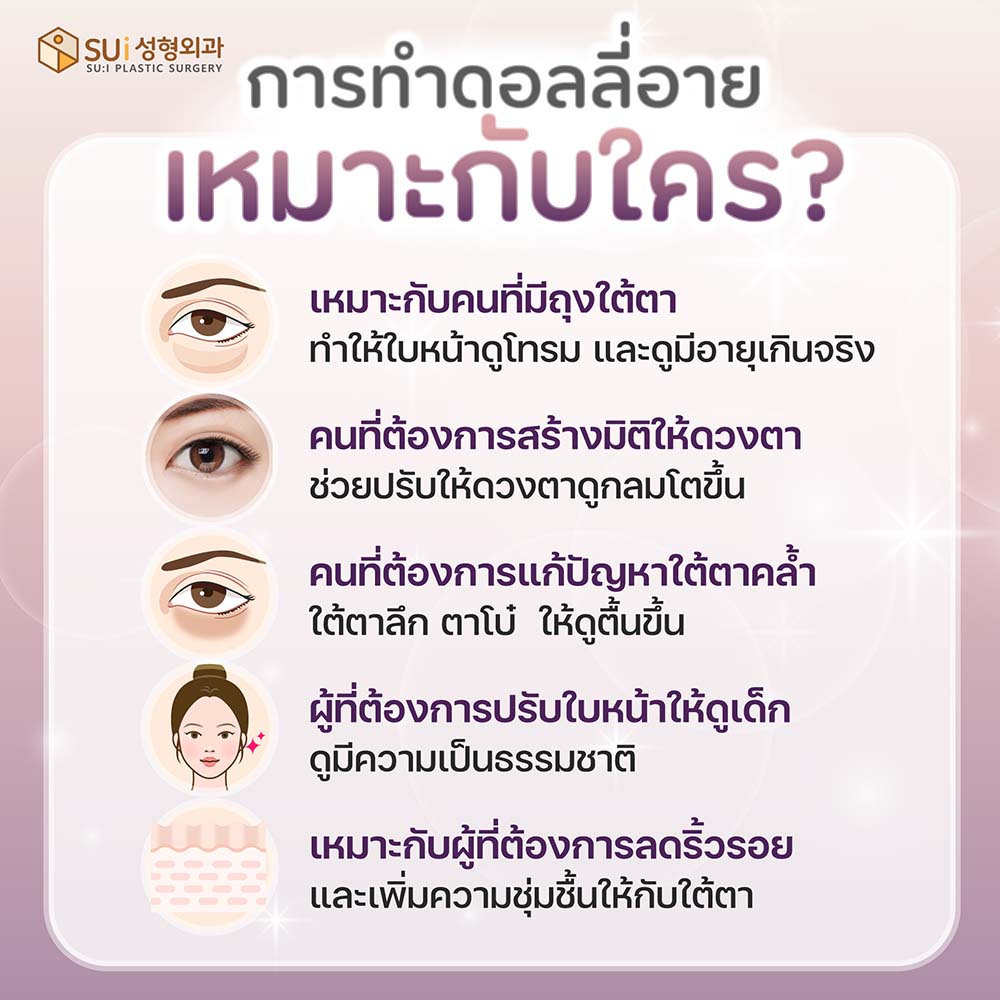 - เหมาะกับคนที่มีถุงใต้ตา ทำให้ใบหน้าดูโทรม และดูมีอายุเกินจริง