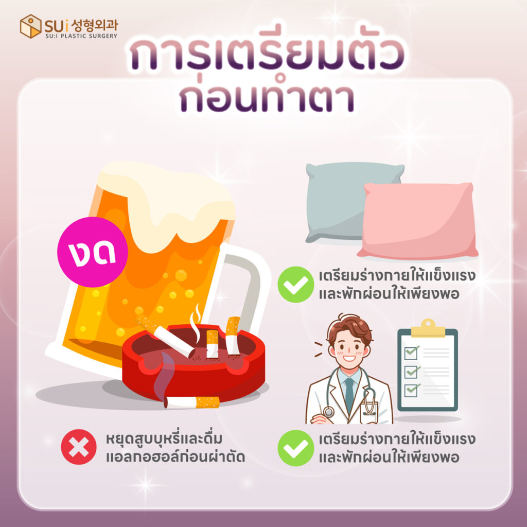 - งดสูบ/ดื่ม: หยุดสูบบุหรี่และดื่มแอลกอฮอล์ก่อนผ่าตัด