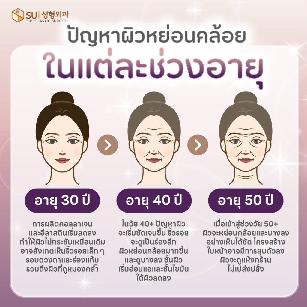 ไม่มีช่วงอายุที่แน่นอน แต่สำหรับบางคนอาจเริ่มมีริ้วรอยและผิวหย่อนคล้อยได้ตั้งแต่ อายุ 25 ปี เป็นต้นไป อย่างไรก็ตาม ปัญหาเหล่านี้จะเริ่มสังเกตเห็นได้ชัดเจนขึ้นในช่วง อายุ 40-50 ปี